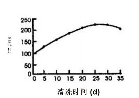 圖2、圖3顯示的水垢清洗過程中循環水濁度和硬度變化趨勢說明,加人GR-943后,濁度和硬度都開始增加,但增加趨勢略有差異。濁度在GR-943加入10d后快速增加,20d時達到大值32mg/L,25d后又開始快速下降。硬度在GR-943加入后呈線形增加趨勢,20d后增幅趨緩,26d時達到大值217mg/L,26d后呈緩慢下降趨勢,除垢過程趨于終點。
